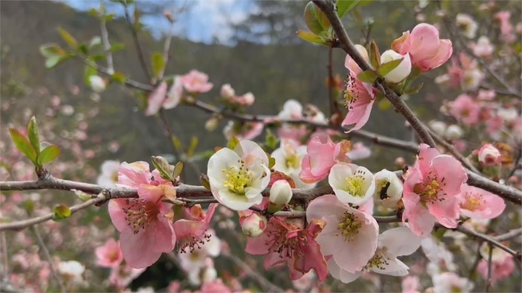 春天百花盛開,台中武陵農場迎接一系列的花季,現在正是貼梗海棠盛開季節,不少花朵盛開,甚至還有極少見的擁有半紅半白的特殊花色,除了海棠,桃花也綻放中,吸引不少遊客上山賞花。