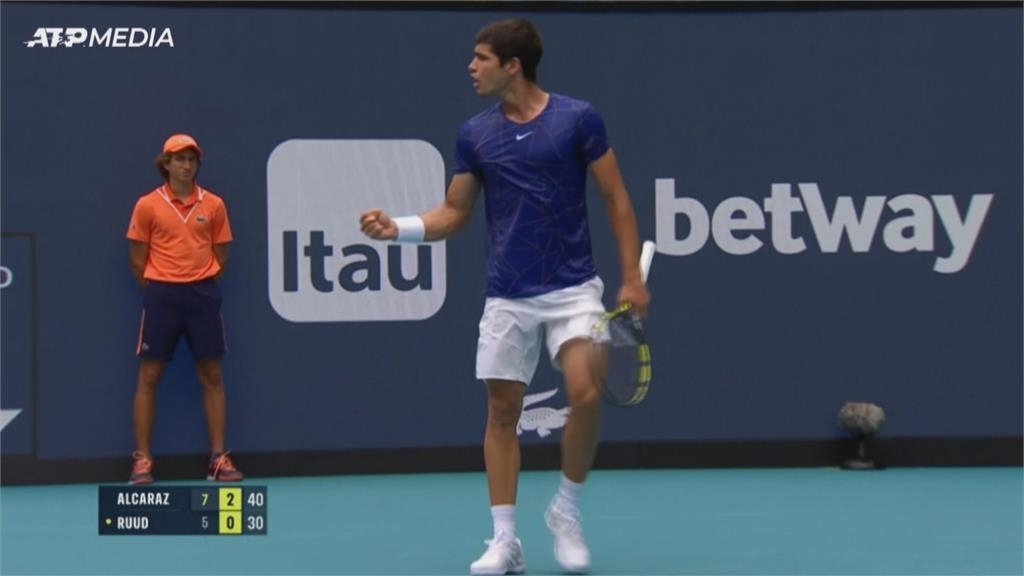 18歲的西班牙超級新秀Alcaraz,在邁阿密男單決賽的對手是挪威一哥Ruud,兩人都是生涯首度打進ATP1000分級大師賽決賽,Alcaraz第7局和第11局接連破發,以7:5搶下第一盤。