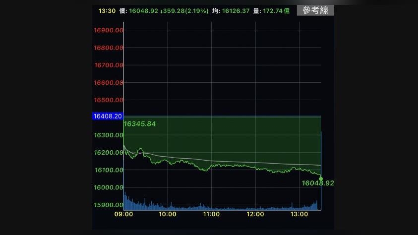 美股上週五收黑,科技股跌勢較重,台股今天開盤持續下挫,指數開低震盪,在買盤縮手及金融、航運跌勢加重下,指數終場下跌359.28點,收在最低點16048.92點,跌幅2.19%,成交金額2398.23億元。