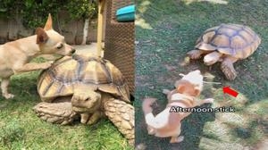 汪星人每天為好兄弟烏龜 「跳自創舞蹈」,並獻上「珍貴禮物」讓對方收下?