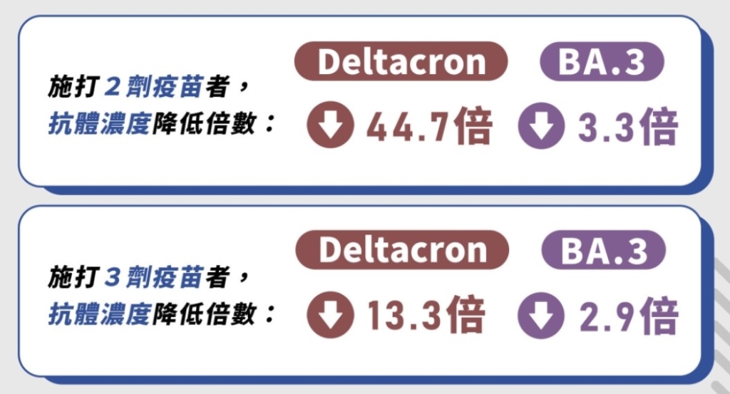 美國俄亥俄州立大學韋克斯納醫學中心檢測10名醫療保健人員的血清抗體水平。平均而言,接種2次疫苗後,針對BA.3與Deltacron的抗體濃度分別比對原始株的濃度低了3.3倍與44.7倍。施打第3劑疫苗後,抗體濃度則降低2.9倍與13.3倍,顯示出保護效果的顯著改善,尤其對Deltacron的效果更為顯著,相差約30倍之多。