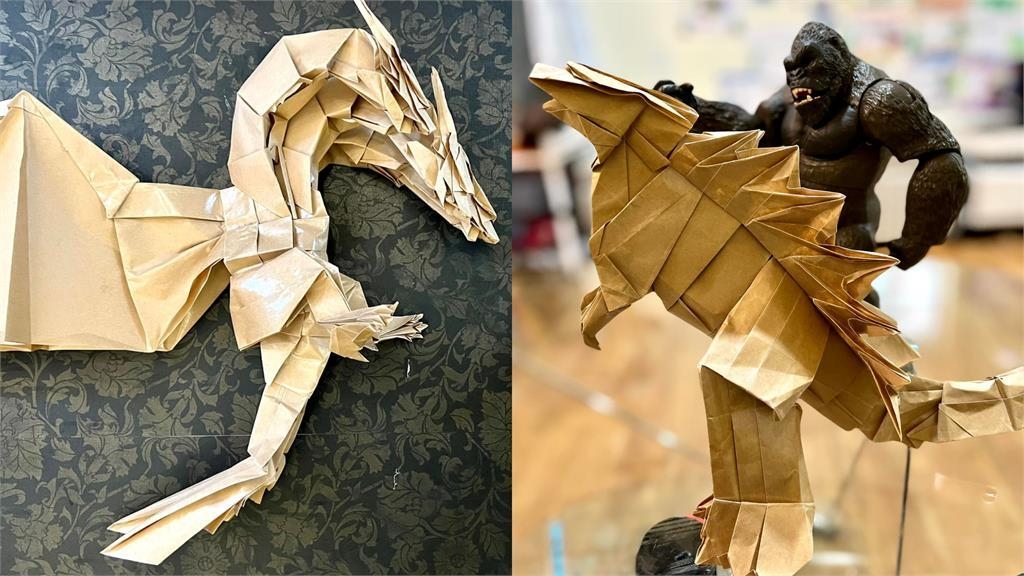 一名爸爸日前在臉書社團「爆廢公社」中一連曬出多張照片,表示兒子最近的幼稚園作業是要摺紙,兒子跑來拜託爸爸摺出一隻哥吉拉和基多拉,還原當初的經典對戰畫面。面對兒子的親情攻勢,讓原PO決定豁出去了,他照著電影海報的畫面,花了一段時間果然沒讓兒子失望,順利完成任務。仔細看成品可以發現,不論是翅膀紋理,還是皮膚皺褶,原PO都神奇地完整重現,讓大批網友驚訝直說「你要逼死其他家長嗎」。
