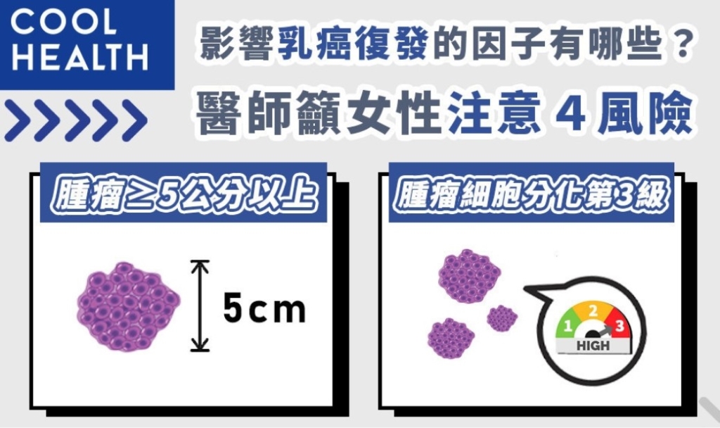 其中屬於「荷爾蒙陽性」的乳癌患者,若為「高復發風險族群」,仍有20-40%會遇到復發問題;逾80%在術後5年會有復發風險、30%發生於術後2年有復發風險。影響早期乳癌復發的風險包括:腫瘤 ≥5公分以上、腫瘤細胞分化程度第3級、Ki-67指數 ≥20%,以及4顆以上的淋巴結感染等因素。