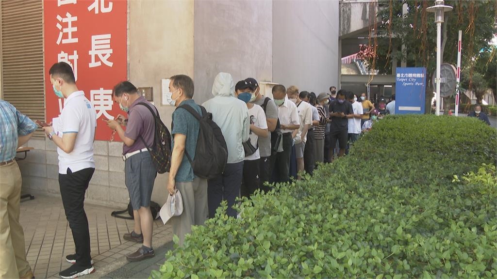 不到九點,長長人龍排在田徑場門口,台北田徑場施打站,首度開打Novavax,上午100個名額很快約滿。