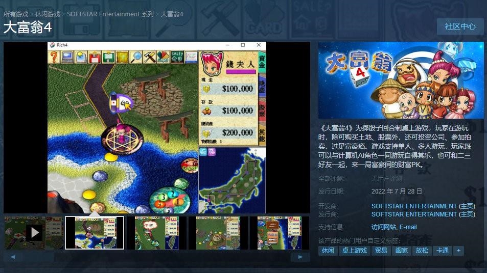 近日遊戲平台Steam的遊戲頁面顯示,《典藏大富翁》(1-3代)與《大富翁4》將於7月28日發行,該消息在社群媒體傳開後,立即引發80、90後的朋友集體暴動,紛紛刷起遊戲中角色的經典語錄,並留言道「四大經典」、「小時候的回憶」、「我們的童年」、「好懷念的介面」、「永遠的神,大富翁4」、「友情破壞遊戲」、「玩完就不是朋友大合集」。