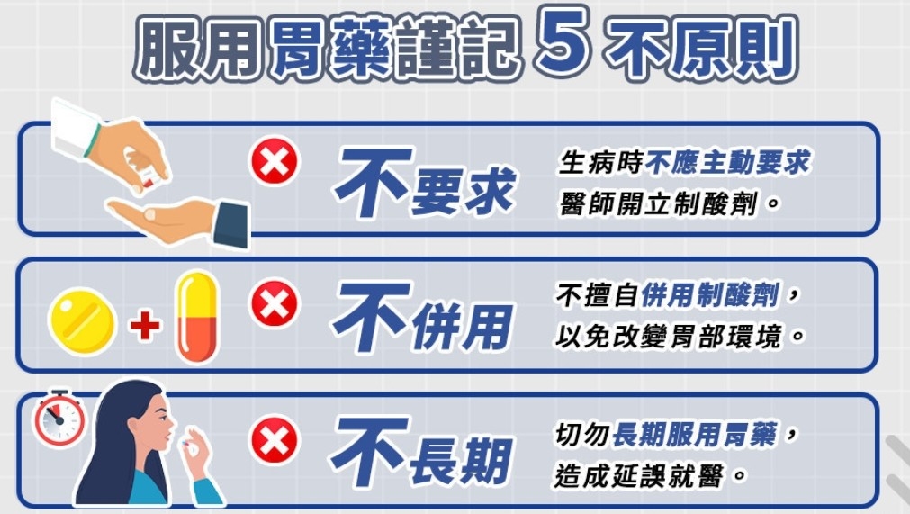 除了解胃藥的基本成分,衛福部食藥署也指出,在使用胃藥期間,民眾應注意以下「5不原則」,避免服藥後胃部不適、引起相關併發症: