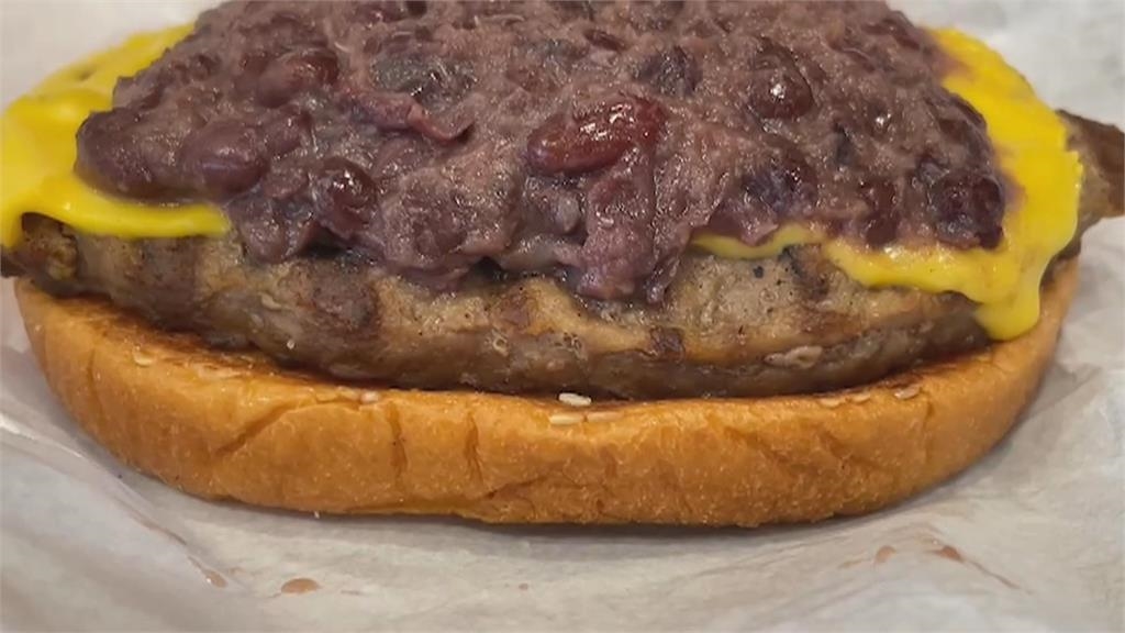 打開漢堡,肉排竟鋪上滿滿紅豆,搭配起士和牛肉,鹹鹹甜甜,令人一口接一口。