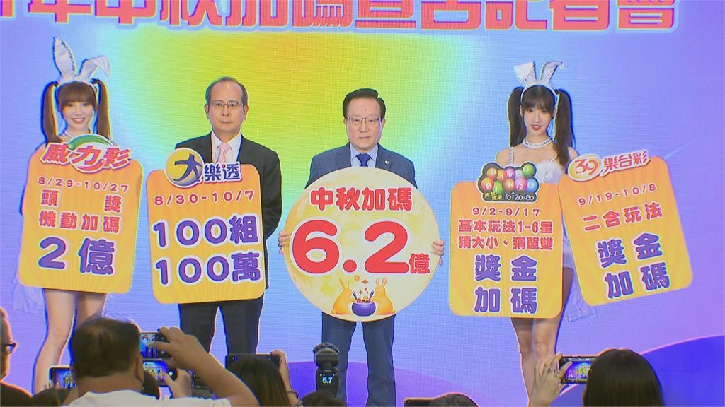 台彩公司董事暨發言人黃志宜說,「另外還有九月二號開始的賓果賓果遊戲,都有獎金加碼方式,還有九月十九日開始的39樂合彩,一注是25塊,頭彩獎金由1125塊加碼到1500塊,所以這個是今年中秋4個加碼活動,總金額是6.2億,我們期待這次的這個加碼,可以讓中秋的這個業績拉抬兩成。」
