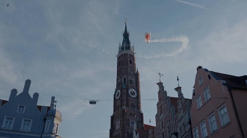 來自美國的Miles Daisher,拉開降落傘準備降落,在這之前他先用相當靠近的距離,繞行超過500年歷史、世界最高的磚塔聖馬汀教堂,接著在巷弄中尋找合適的降落地點。
