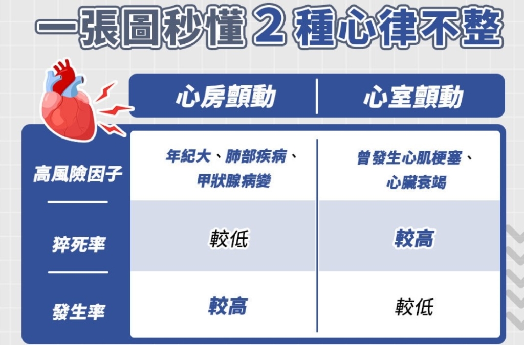 張伯丞醫師表示,心律不整可以分為心室顫動與心房顫動,兩者的誘發因素雖有部份重疊,但發生機制不完全相同。心房顫動的高風險因子包括年紀大、肺部疾病、甲狀腺病變;心室顫動的高風險為曾發生心肌梗塞、心臟衰竭。心室顫動雖猝死率較高,但發生率不如心房顫動高。