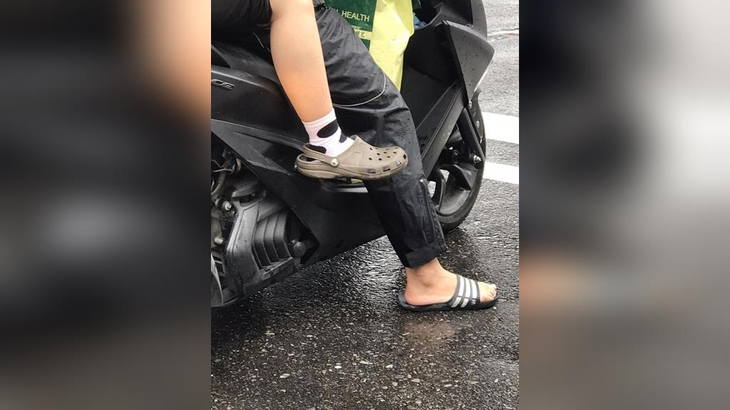 近日受到今年第12號颱風「梅花」的外圍環流影響,全台部分地區降下豪大雨,許多騎車外出民眾為了不讓鞋子淋到雨,都會選擇穿拖鞋出門。不過,近日有網友發現有路人雨天竟穿著洞洞鞋配上襪子,覺得這樣的穿法相當奇特,於是將畫面拍下PO上網,貼文一出,立刻引發討論。