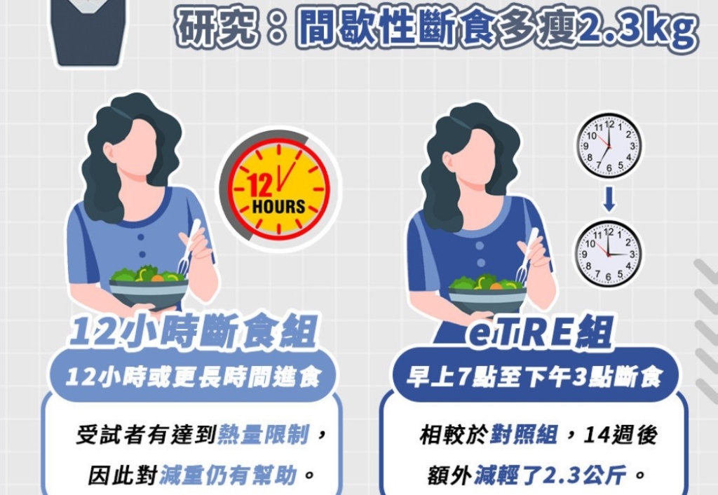 間歇性斷食是近年風行的減重方法,不過,斷食效果可能會受時段影響,甚至影響心臟代謝健康?《美國醫學會內科醫學》(JAMA Internal Medicine)2022年8月份登刊一篇研究指出,較早時段的限時飲食」(early time-restricted eating,簡稱eTRE),比起12小時或更長時間內進食,更能有效的達到減輕體重。