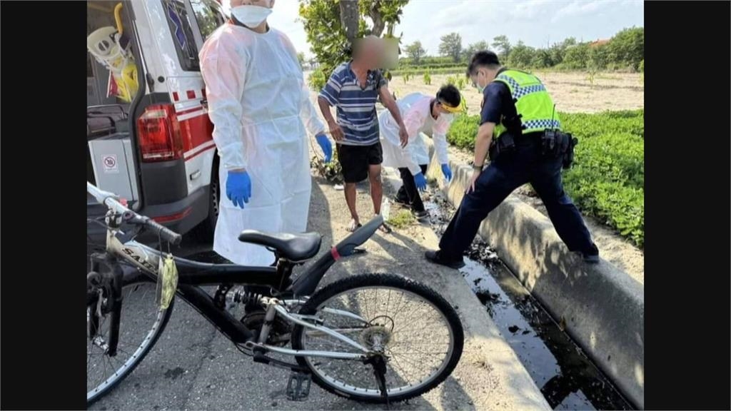 台西警分局副分局長李建興說,「有位滿頭白髮老翁跌坐在水溝內,騎乘腳踏車遇強風吹襲不小心摔落。」