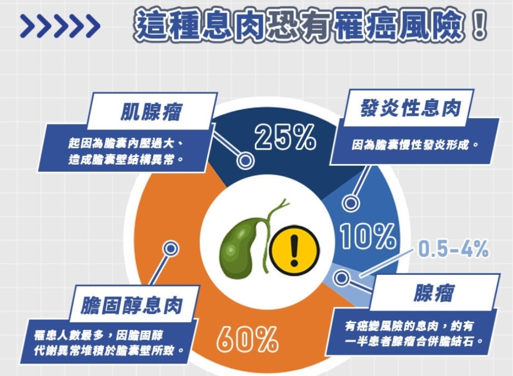 佔所有患者的比例最多(60%)。膽囊息肉超過一半是膽固醇息肉,肇因於膽固醇代謝異常堆積於膽囊壁所導致。