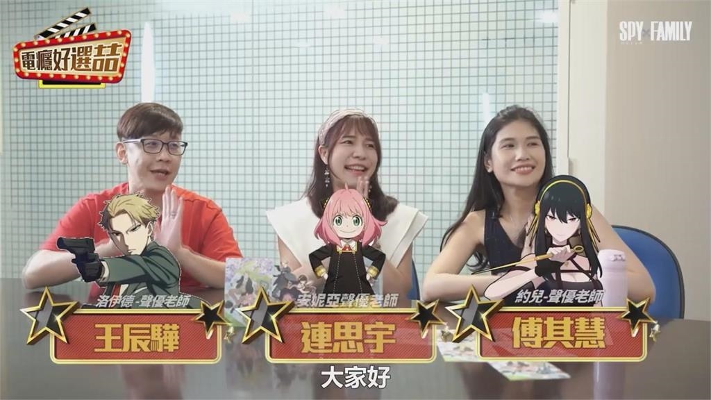 日本超人氣動漫《SPYxFAMILY 間諜家家酒》在台灣剛播出就大受歡迎,近期推出的中文配音版本,也廣受好評。飾演「洛伊德」的王辰驊老師、飾演「安妮亞」的連思宇老師、以及飾演「約兒」的傅其慧老師,三人日前接受YouTube頻道「好選喆+ 電癮好選喆」專訪。除了間諜家家酒,他們也都有替知名遊戲「傳說對決」配音,三人在各種角色、聲線間來回切換,讓主持人簡立喆嘆為觀止,而安妮亞的「女鬼版」演繹,更是讓眾人都笑翻。
