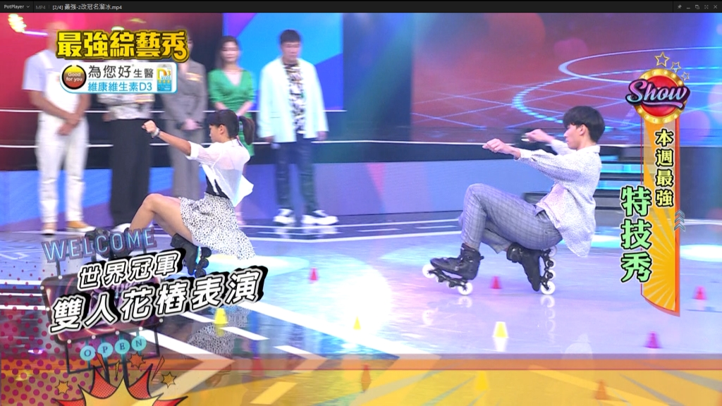 直排輪逐漸變成了現代運動競技項目,本週邀請到自由式滑輪花式花樁的台灣之光-邱映暄與周柏崴兩人來到節目中表演。因攝影棚場地問題,而縮短了花樁的擺設距離,但表演起來還是發揮了世界級的水準。瓜哥竟也穿起了直排輪,說自己之前也是校隊出身,可現場移動起來,但眾人像是扶老人做復健的樣子,令全場笑成一團。最精采有趣的表演內容都在本週六晚上8點民視《最強綜藝秀》!