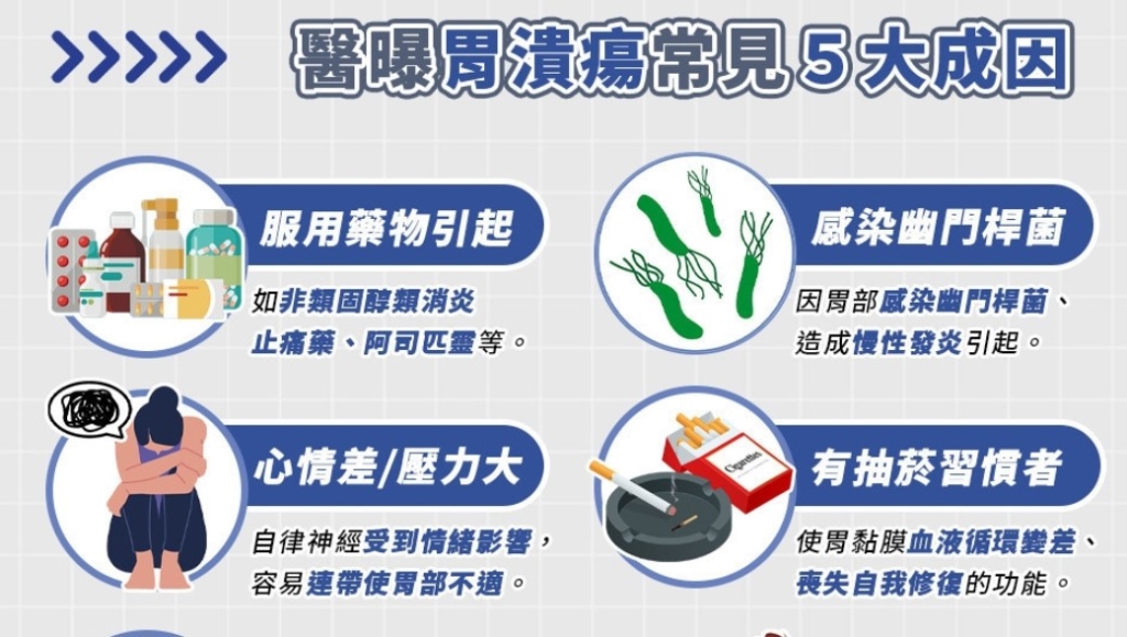 錢政弘醫師提醒民眾,胃潰瘍常見的成因有以下5項,須留意避開以下風險: