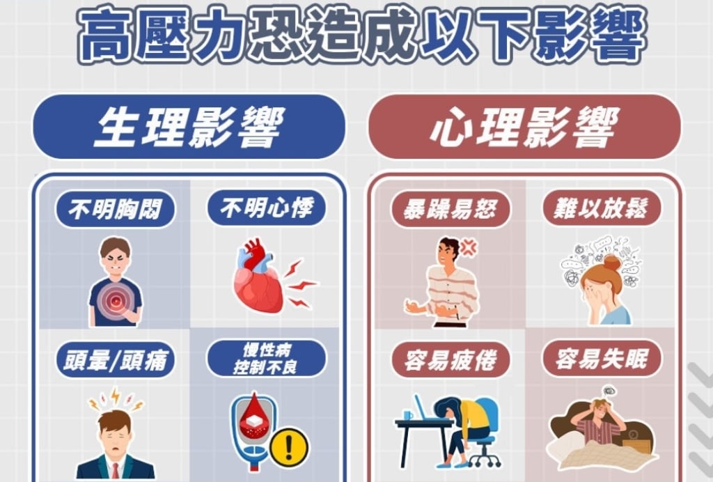 陳奕安醫師指出,長期處於高壓環境且無適當排解,對生理、心理都有劇烈影響:生理方面,可能出現不明原因的胸悶、心悸、頭暈頭痛,慢性病患者(如糖尿病、高血壓)疾病控制不良、腸胃道症狀(如胃食道逆流、消化不良)惡化。壓力也容易影響荷爾蒙分泌,導致肥胖或體重過重。