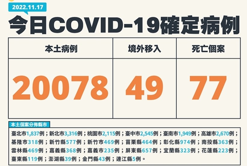 指揮中心指出,今日新增77例本土病例死亡個案,為46例男性、31例女性,年齡介於40多歲至90多歲以上,皆屬重度感染、76例具慢性病史、58例未接種3劑以上COVID-19疫苗。確診日介於今年10月7日至11月14日,死亡日期介於10月25日至11月14日。