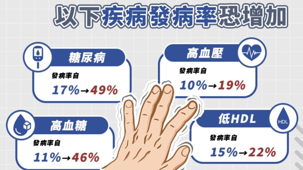 4. 低HDL狀況自15%增至22%。