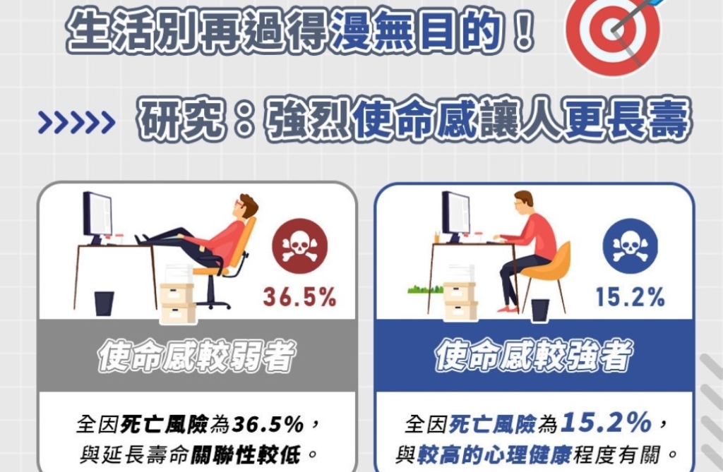 強烈的「使命感」能夠讓人活得更久?生活過得漫無目的可能需要改變一下生活方式!根據《Preventative Medicine》的最新研究指出,無論是受到強烈的使命感或微小的目標驅使,可能有助於預期壽命的增加,且該影響無論種族、性別與居住地。