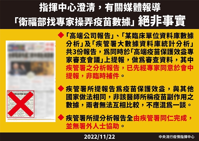 ▲指揮中心澄清,有關媒體報導「衛福部找專家操弄疫苗數據」絕非事實。(圖/中央流行疫情指揮中心提供)