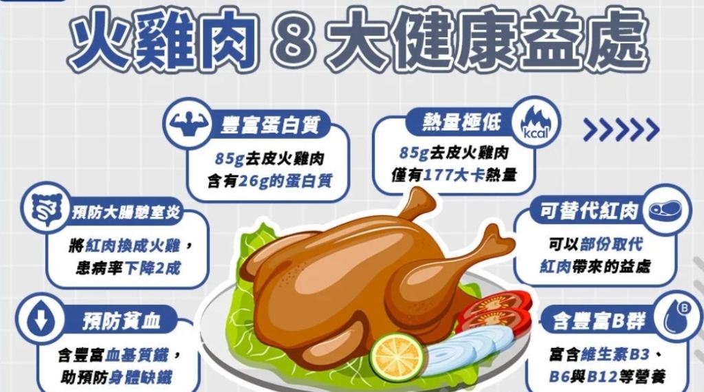 至於火雞具有哪些營養成分?對身體又具有哪些好處?以過往學界發布的研究與指南而言,大致上有以下8種好處,若目前正處於減重階段、或想改善飲食內容的民眾不妨參考:
