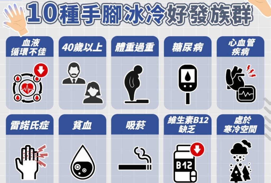 不過,血液循環不良並非手腳冰冷的唯一主因。《Cleveland Clinic》也表示,罹患「雷諾氏症」(Raynaud's disease) 、貧血、糖尿病、動脈疾病、吸菸、維生素B12的缺乏,以及長期處在寒冷的環境中,亦可能為手腳冰冷的潛在因子。手腳冰冷往往也可能伴隨過度虛弱、膚色蒼白或胸悶胸痛等狀況。