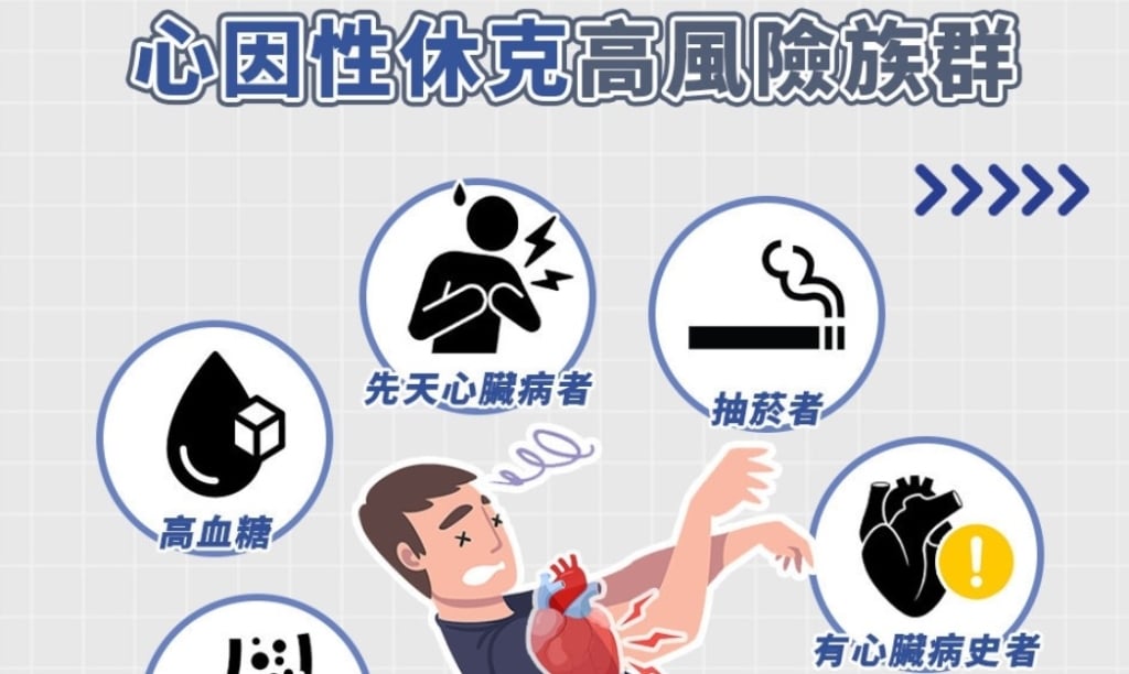 高敏敏營養師解釋,心因性休克主要的成因為心臟功能不良、血流無法供應全身所需,導致血壓下降進而產生昏迷休克的現象。常抽菸者、酗酒者、高血壓、高血脂、高血糖、有心臟病史、先天心臟病者皆為高風險群。年輕人若長期熬夜、生活壓力大、生活習慣不佳,也可能是心因性休克的潛在風險族群。