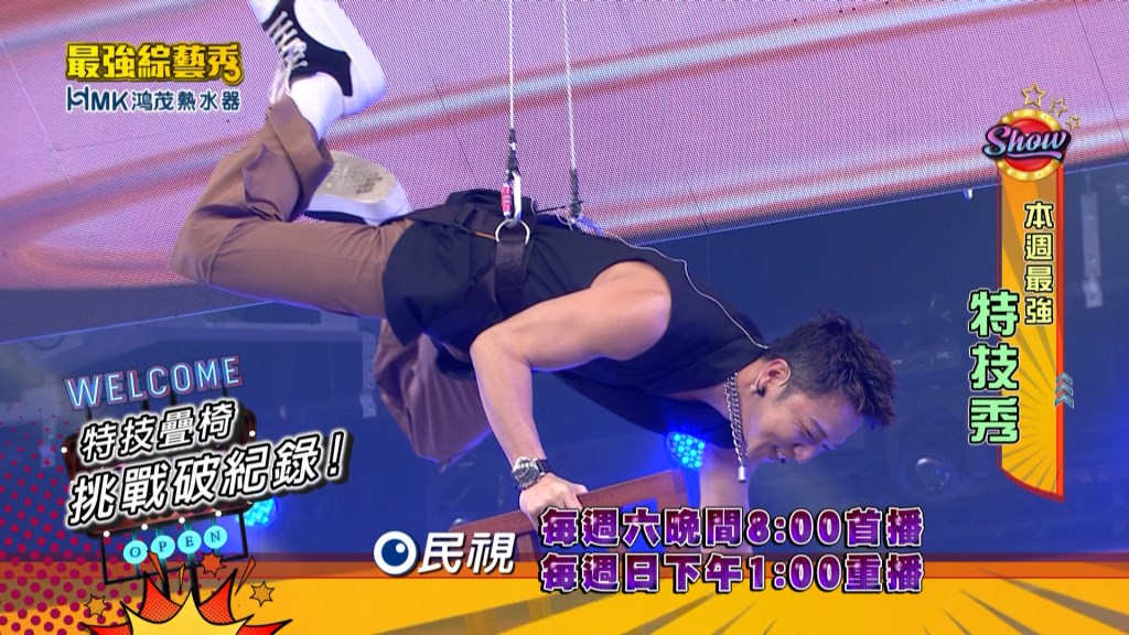 本週《最強綜藝秀》-「最強特技秀」請到表演團體-追光者,挑戰台灣的最高紀錄-疊七張椅子,表演當下椅子搖晃的程度,用肉眼都能清楚看見!在沒有吊鋼絲的情況下,在高達近6米的椅子上倒立,挑戰成功的那刻令人動容。