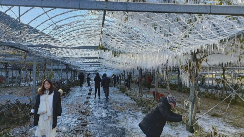 東北季風持續發威,武陵農場25日早上6時至8時之間,出現零下4.9度低溫,農場曝光連日早晨的低溫造成植物棚架冰封一片,澆灌水滴、露珠結霜成為一根根冰柱,美得有如「水晶宮殿」,掀起網友熱議,吸引不少民眾驅車前往現場欣賞冬季限定的凍天美景。