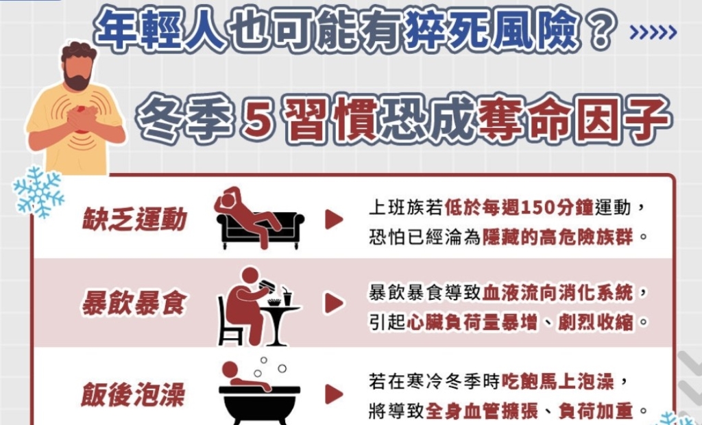 上週週末(17-18日)寒流強襲台灣,僅1天就造成68人猝死,意外降臨的速度令人防不勝防。而寒流、溫差過大造成的心血管問題,不僅容易發生於長者、三高患者、吸菸飲酒者或肥胖者等高風險族群!重症醫學專家黃軒醫師警告,年輕族群平時有「5種習慣」改不了,寒流來襲時同樣容易暴露在致命的危機中。