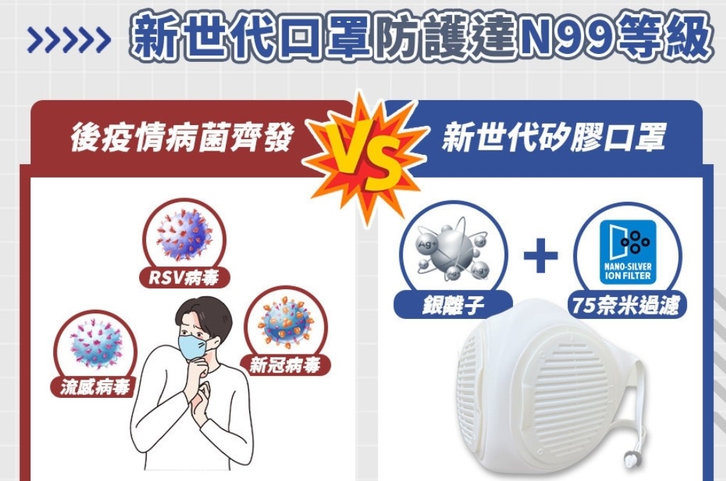 除此之外,新世代奈米矽膠口罩通過美國佛羅里達大學醫學院生物安全三級實驗室認證 ,透過30奈米粒徑的銀離子以島狀結構分布,15分鐘就能消滅新冠病毒,結合專利濾片將病菌吸附於不織布表面,並抑制病菌生長,更能阻絕PM2.5等懸浮微粒與廢氣污染,給予配戴者潔淨安全的呼吸空氣。