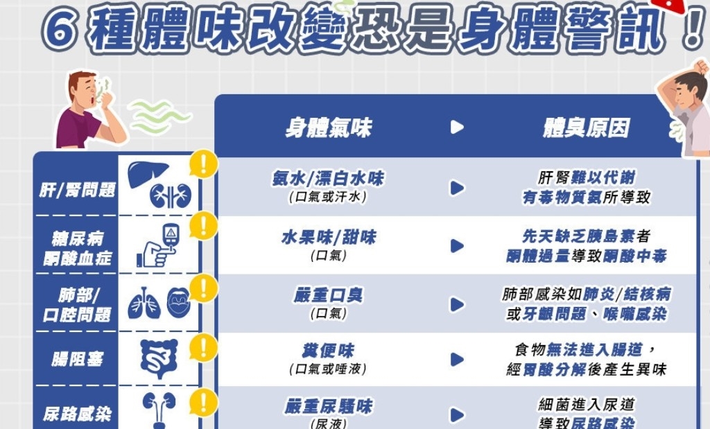 身體體味的改變,其實是暗示各器官開始出現健康問題?若此前並無罹患狐臭、多汗症等問題,但身體卻突然飄散出難聞的氣味,須特別留意肝、腎;腸等器官正在「無聲抗議」。《潮健康》特地整理以下數項研究資訊,提供民眾參考,但以下內容並不能取代醫師診斷,若遇到極度不適仍建議立即就醫: