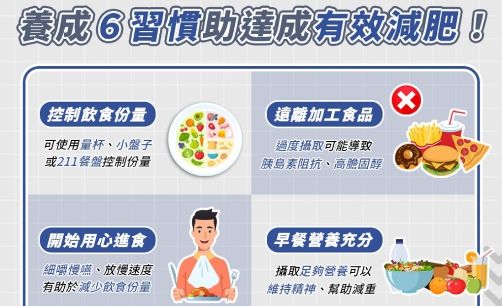 而主動採取份量控制的做法,例如使用較小的盤子、採取「211餐盤」、使用量杯分配食物、消化20分鐘再吃下一份食物等皆為可行。另外,與熱量計算之間的搭配也很重要,這能讓個人對飲食熱量產生意識,也更有助於達成「熱量赤字」。