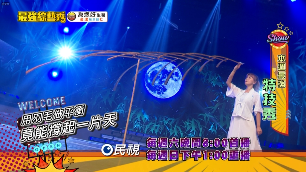 本週《最強綜藝秀》-「最強特技秀」邀請到全台少見神奇的羽毛平衡大師-游庭宜,她帶來一場需要屏住呼吸的表演。一點點的風吹草動的可能影響表演的呈現,讓在場所有藝人都不敢大肆晃動!如此優美的表演卻是在一個恐怖平衡下完成,在羽毛拿開後重達6公斤棕梠枝嘎然跌落,讓現場的大家驚呼連連!