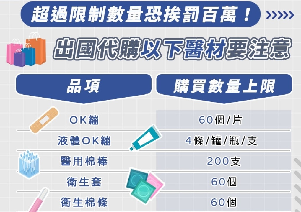 除了管制藥物,民眾出國旅遊,難免替親友「代購」商品,當作旅費補貼。事實上特定醫療器材亦有相對應的數量上限,若超過上限或未經申請,可依法處3-100萬元的罰鍰。若符合該品項及數量規定,無須事先申請核准即可便捷通關;若超過數量或未經核可,則應取得食藥署核准才可輸入自用;如不確定產品是否為醫療器材,可至食藥署之許可證資料庫做查詢。