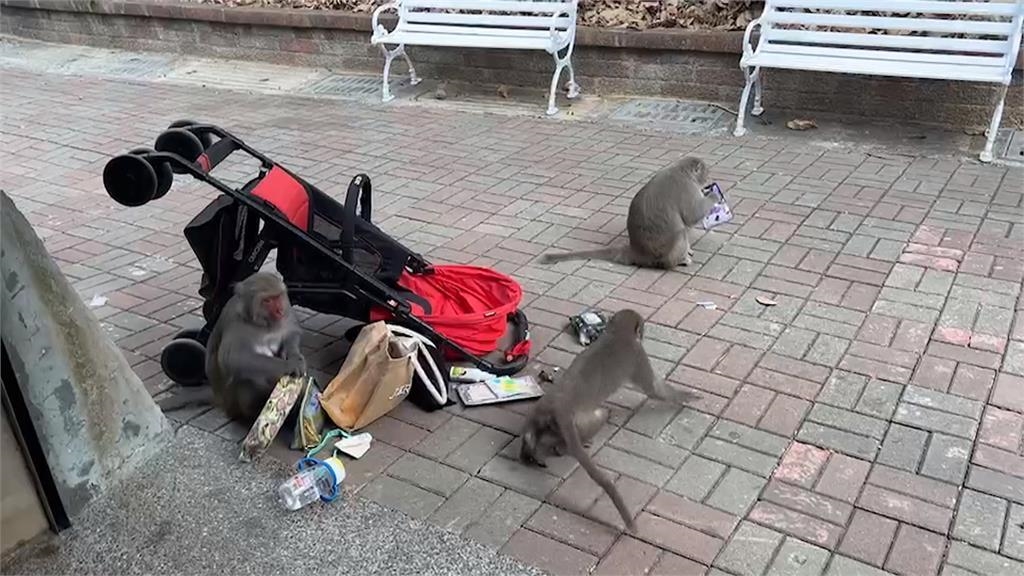 兩三隻獼猴包圍一輛嬰兒推車,車上的物品全被翻到地面,還有掛著的媽媽包也無一倖免,猴子們東翻西找,只要看到有吃的就會搶奪,當事人看傻了眼原本有出聲嚇阻,但寡不敵眾還被猴子齜牙裂嘴的恐嚇。