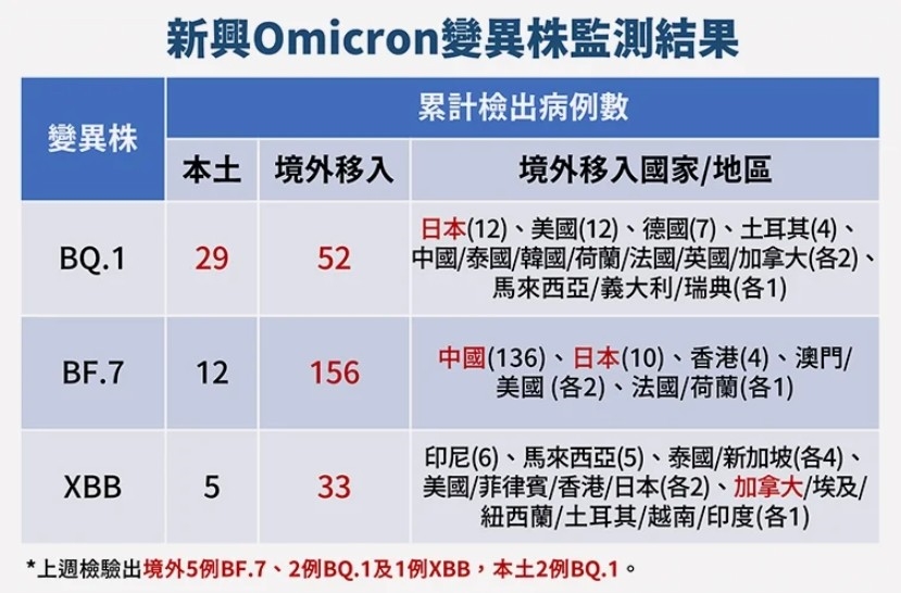 中央流行疫情指揮中心在今日宣布基因定序結果,共有51例的Omicron變異株病例,其中23例本土個案有15例BA.2.75、4例BA.5、2例BA.2、2例BQ.1;28例境外移入則有13例BA.5、5例BA.2.75、5例BF.7、2例BA.2、2例BQ.1、1例XBB。