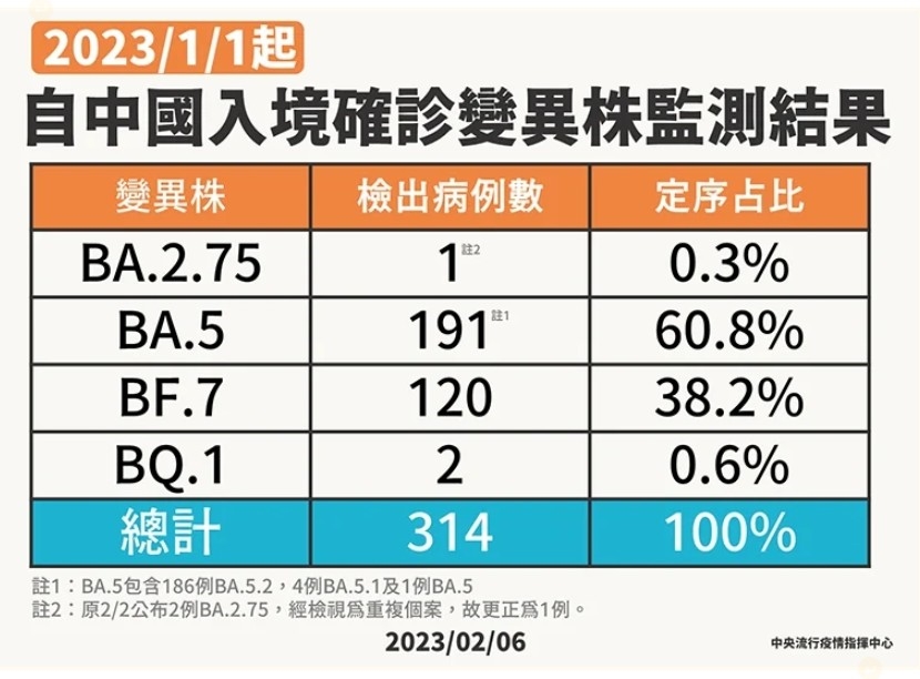 針對自中國入境來台旅客及小三通專案入境旅客的唾液PCR採檢,指揮中心透露,到2月4日共有52521人檢驗,共有4247人確診,陽性率8.1%。陽性率並沒有巨大改變;同時變異株監測也無重大發現,未檢出特殊變異株,因此唾液PCR將實施到今日為止。