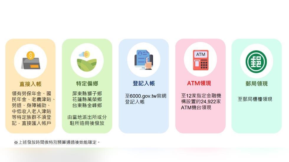 - ATM領現:發放對象健保卡號、身分證字號或居留證號、提款卡
