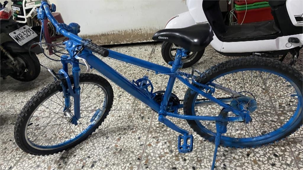 整輛車都噴上了藍色的漆,東一塊,西一塊,塗得七零八落。據了解,竊嫌騎走後,為了掩人耳目,替車「重新烤漆」。失主欲哭無淚,因為這輛腳踏車,原價可要1萬元新台幣。