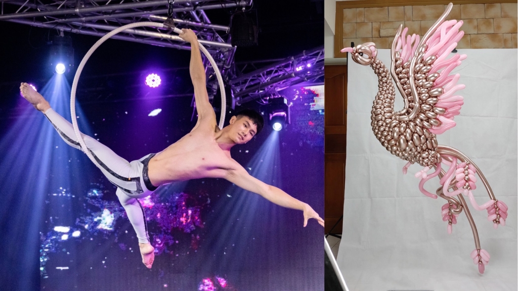 除氣球創作,洪璽皓從小夢想進入演藝圈當藝人,近1年來他在《最強綜藝秀》、《綜藝大集合》綜藝節目,空中環表演驚豔全場,19歲現就讀大學的洪璽皓這次參加全球知名氣球公司Qualatex舉辦的指定色造型氣球創作大賽,這次獲獎的「鳳凰」,高180公分、寬100公分,耗時15小時,使用500條氣球,贏得季軍佳績。多才多藝的他,之前以氣球派對、場地布置等接案工作為主要收入來源,但3年前因疫情爆發,群聚活動都停辦,氣球創作收入頓時變成零,疫情這段時間沒工作,但他也轉念,除嘗試自學製作甜點,也抽空自學人體彩繪及美甲並考取證照,氣球則轉為藝術創作興趣。