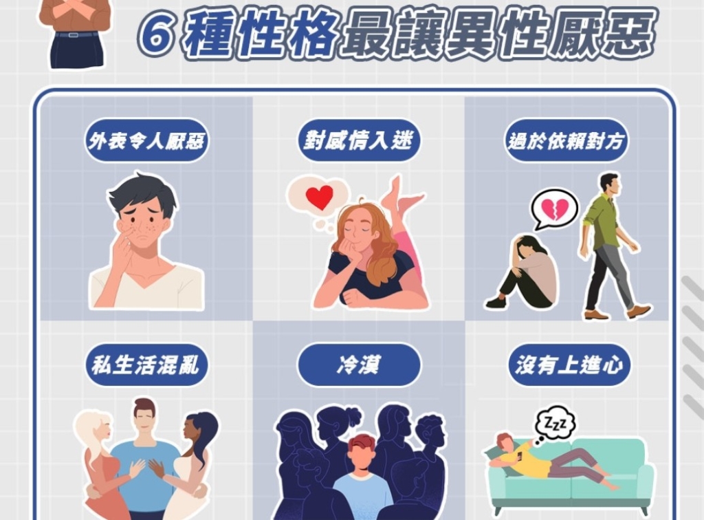 想要成為異性眼中的完美對象,首先得避免成為曖昧關係的「破壞者」?根據《Personality and Individual Differences》期刊刊載研究指出,6種使異性厭惡的性格:外表令人厭惡或行為粗俗(gross)、對感情過於入迷(Addicted)、過於依賴對方(clingy)、私生活混亂或濫交(promiscuous)、冷漠(apathetic)和沒有上進心(unmotivated),最容易破壞與異性之間的關係。