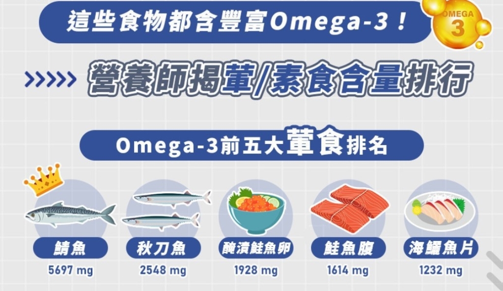 至於平時該如何從飲食中攝取?在此奉上Omega-3葷食、素食含量前五名(本數值單位均為每100公克食物含量):
