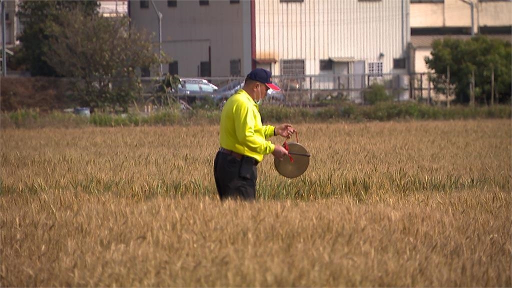 黃澄澄麥田,麥農手不停敲著鑼,來回穿梭其中,鑼聲一響,藏在麥田裡的鳥賊們,隨即展翅飛起,迅速逃離,案發現場。