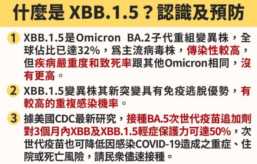 XBB.1.5的佔比不僅超出BQ.1許多,還具有高傳染性,不過,根據去年10月到現在各國的統計與研究顯示,XBB.1.5的疾病嚴重度、致死率與其他Omicron變異株相同,並沒有提高的情況。