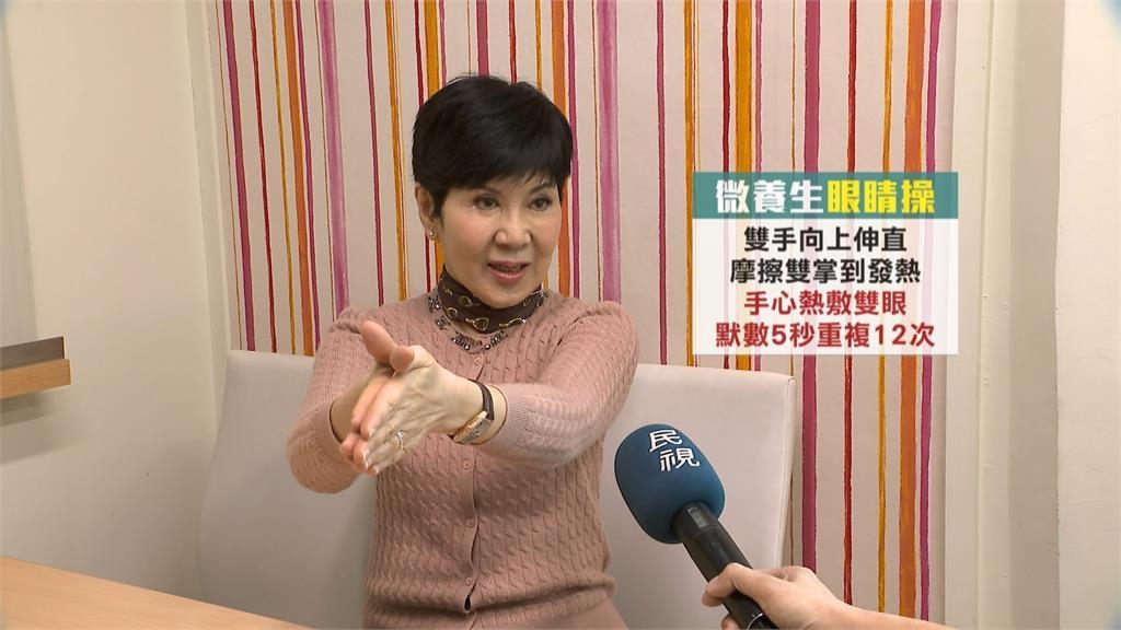 她大方分享從百歲人瑞學來的「眼睛操」,第一步先用溫暖手心熱敷雙眼,默數5秒、重複12次。