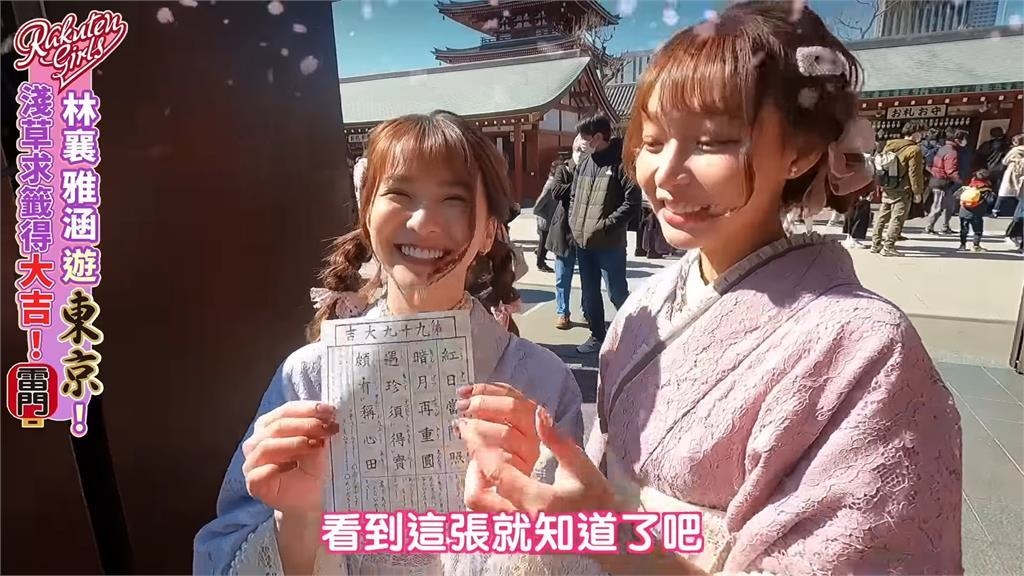 影音中心/莊薇妮報導中職啦啦隊「Rakuten Girls」女神級成員林襄與張雅涵(Kimi),擁有甜美外表與火辣身材,在國內外都有超高人氣。近日兩人在東京旅遊時,於雷門淺草寺為樂天桃猿抽中大吉籤,而籤詩寓意球隊獲得「上天的恩惠」,讓網友紛紛驚嘆,會不會是指剛加入樂天女孩的李多慧。