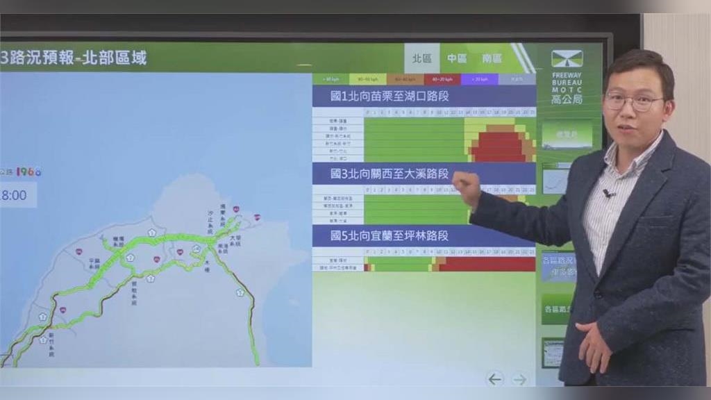 陳立哲進一步說,國1北向西螺至埔鹽系統、南屯至后里路段,下午1時至晚間9時車流量多,國3竹山至中興、北向草屯至霧峰路端,下午3時至晚間7時車流量大。南部區域,除了國1北向鼎金系統至高科路段、大灣至台南系統路段中午時間車流量較大,其餘時間車流量正常。
